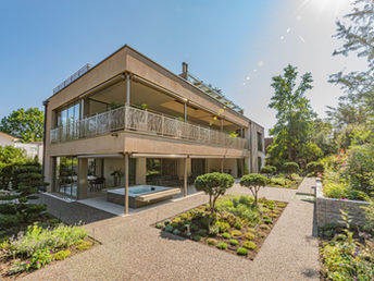 Hier geniessen Sie unbeschwert die Grosszügigkeit und Ruhe einer Villa und bekennen sich gleichzeitig zu einer ökologischen und CO2 neutrale konstruktive Holzhybrid-Bauweise ergänzt mit einer Photovoltaik-Anlage zur Stromproduktion für die LW-Wärmepumpe.